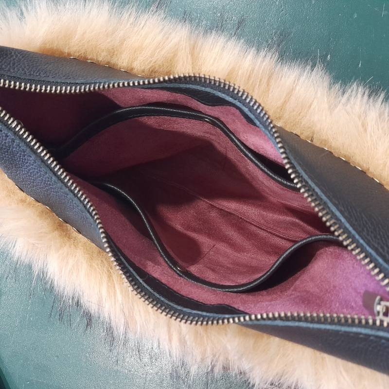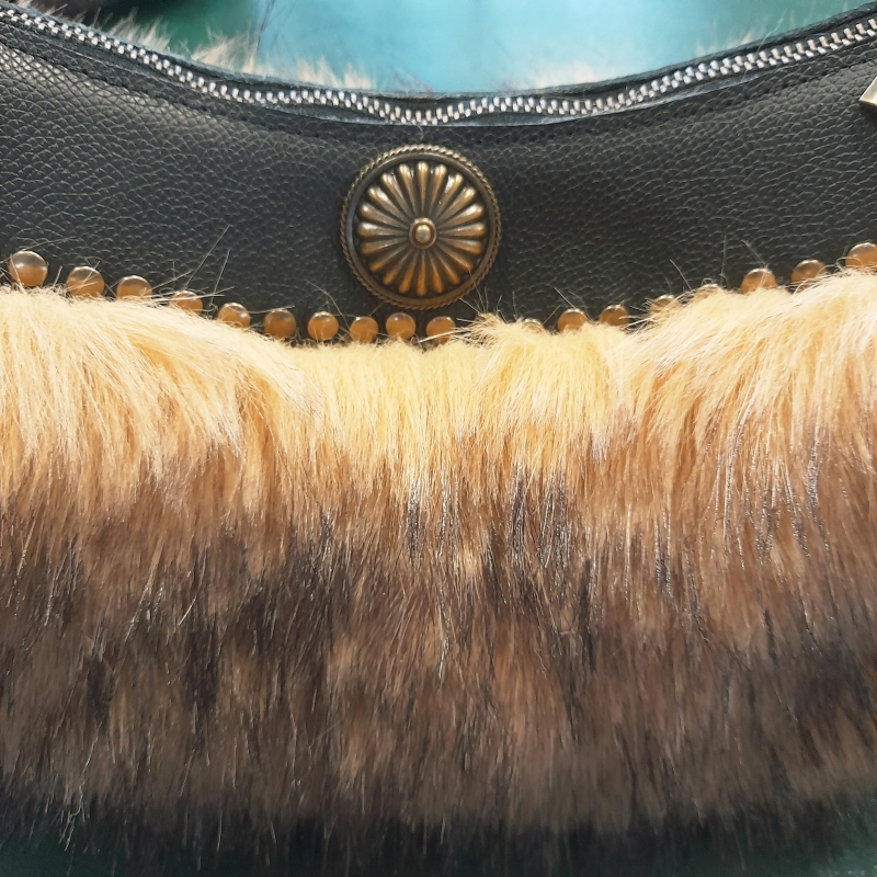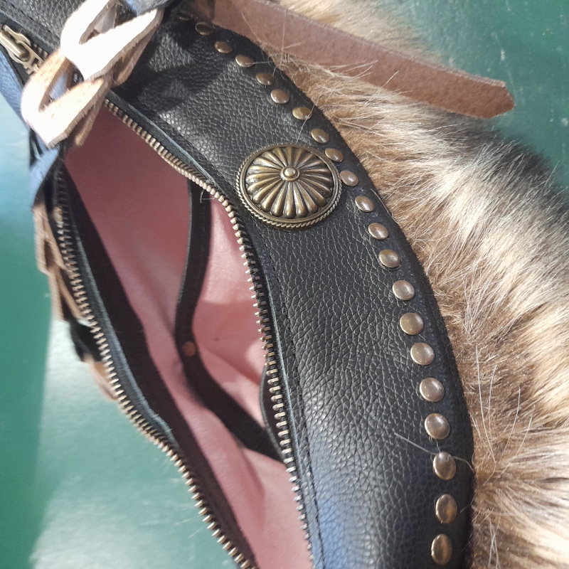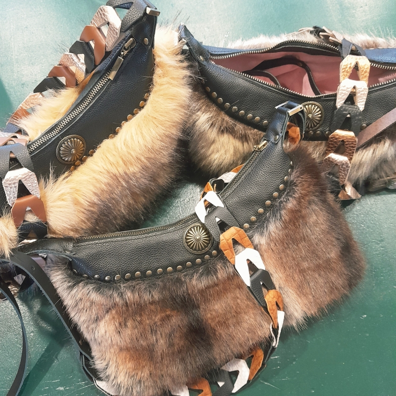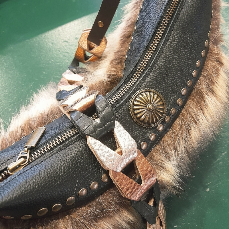 We werken met voorbereide onderdelen die je als eerste bij elkaar gaat zoeken: imitatiebont geknipt en verstevigd, suédine geknipt en afgelockt en de zwarte leeronderdelen en bijbehorende ijzerwaren in de kleur brons. Je gaat aan de slag achter de naaimachines en zet de tas in elkaar. Fijn als je ervaring hebt achter de naaimachine. Zelf alles in elkaar zetten en mij laten stikken, is ook een optie.